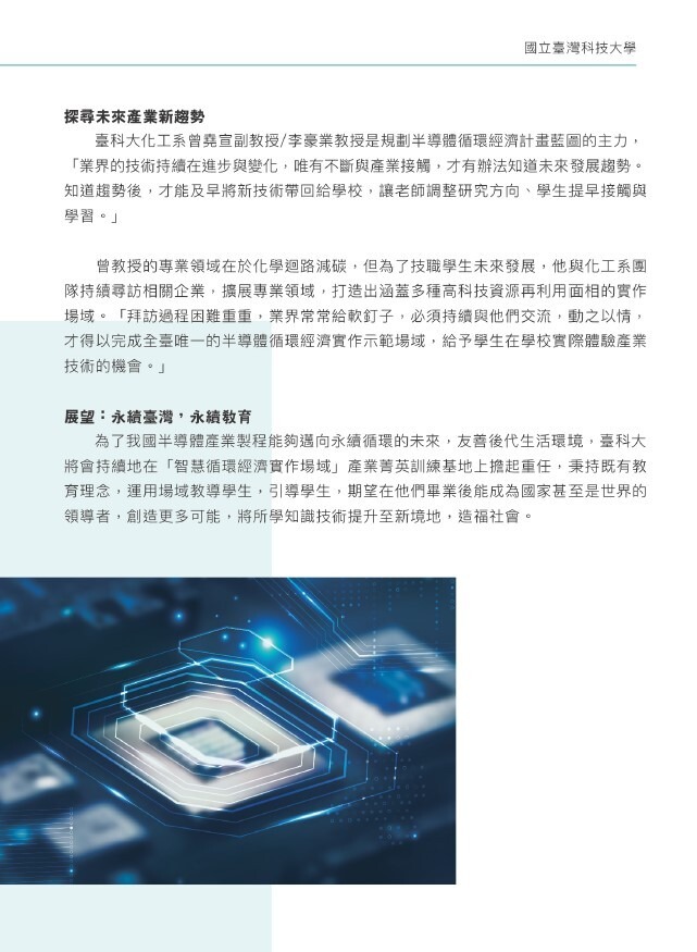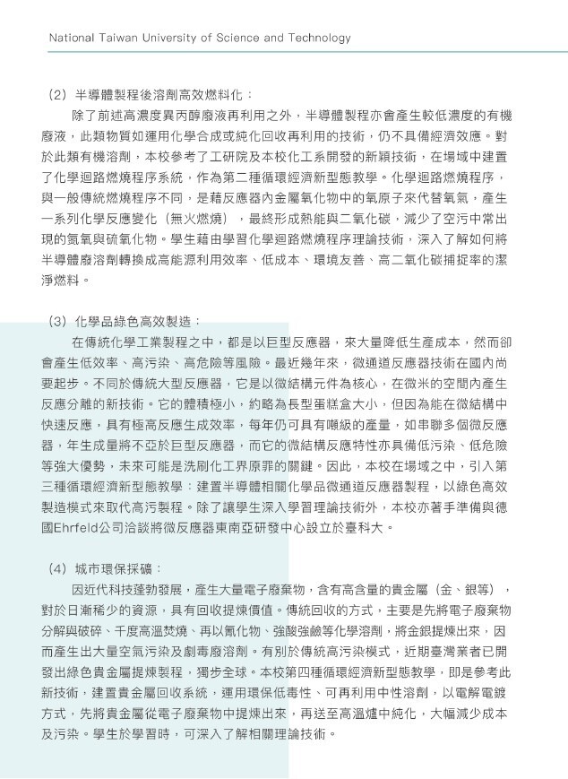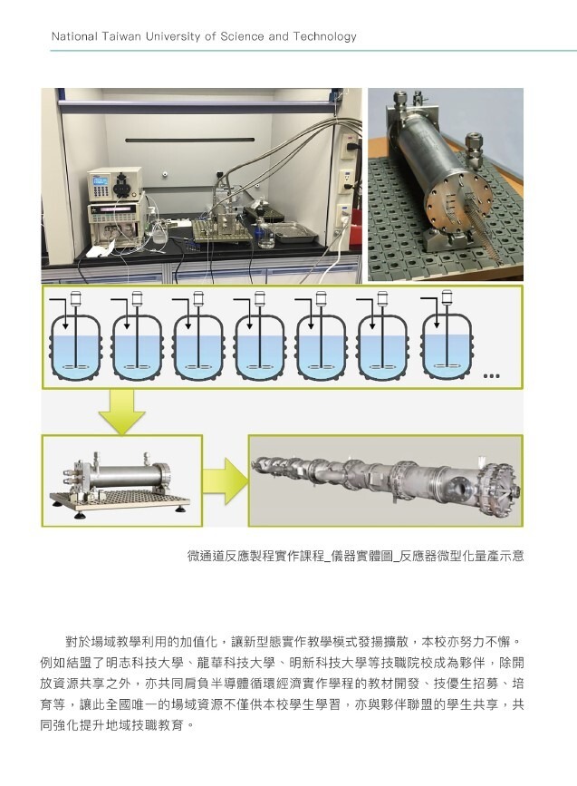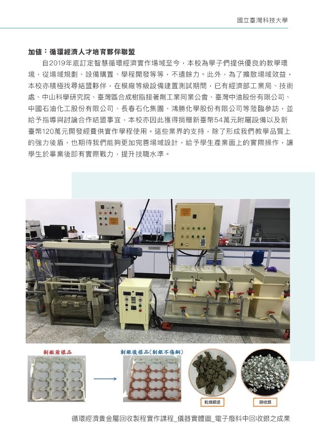 To cultivate students' practical abilities in Circular Economy processes and to enhance hands-on learning through industry-academic collaboration, this initiative aims to ensure students are "job-ready" upon graduation. With support from the Ministry of Education's "Program for Optimizing Practical Environments in Vocational Colleges," the university has acquired factory-scale pilot equipment and analytical instruments related to the Circular Economy. The Industrial Elite Training Base was established in Engineering Building II of the Department of Chemical Engineering. This project has developed four practical Circular Economy courses for students from Taiwan Tech and our partner institutions (Ming Chi University of Technology, Lungwa University of Science and Technology, and Minghsin University of Science and Technology) to facilitate talent cultivation through hands-on internships.