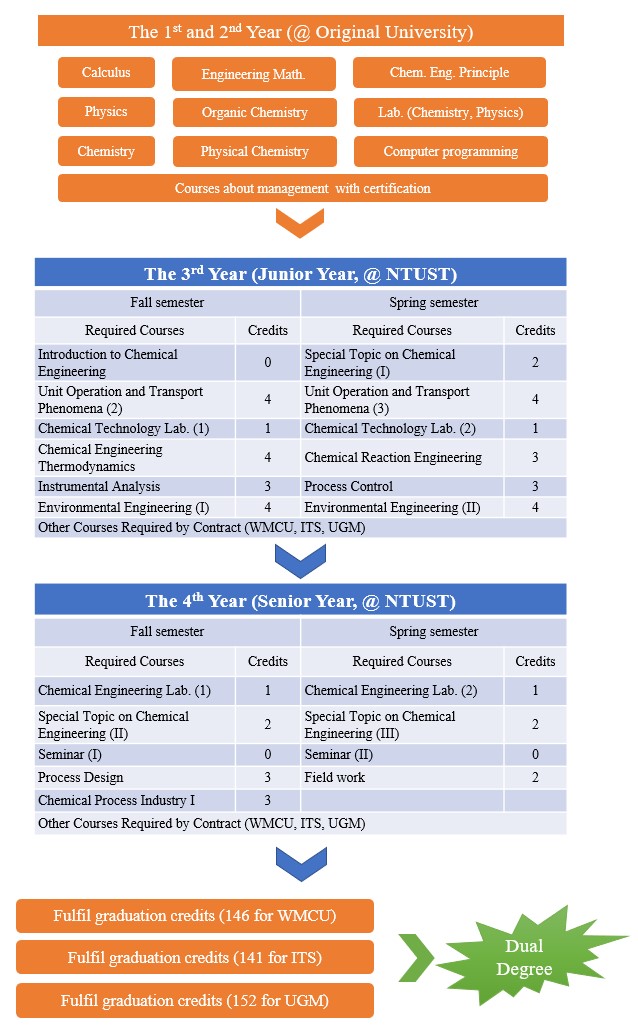 Students will spend the first two years of their undergraduate studies at WMCU and the next two years at Taiwan Tech. After completing graduation requirements, students will be offered Bachelor of Science degrees from WMCU (or ITS, UGM) and from Taiwan Tech.